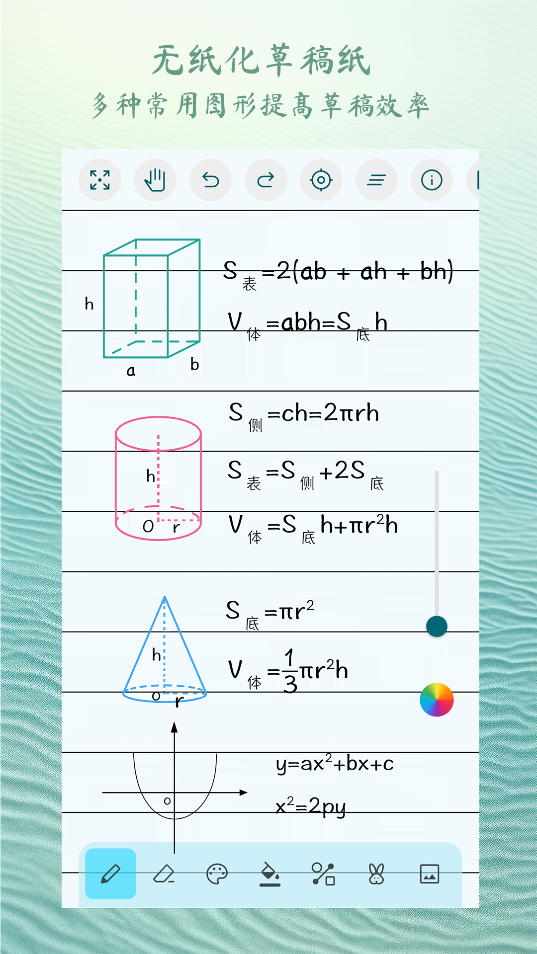 - 各种效果画笔:包含圆笔、毛笔、荧光笔、马克笔、勾线笔、钢笔、碳笔、蜡笔、水彩笔、彩色笔、星空笔、彩虹笔等画笔;